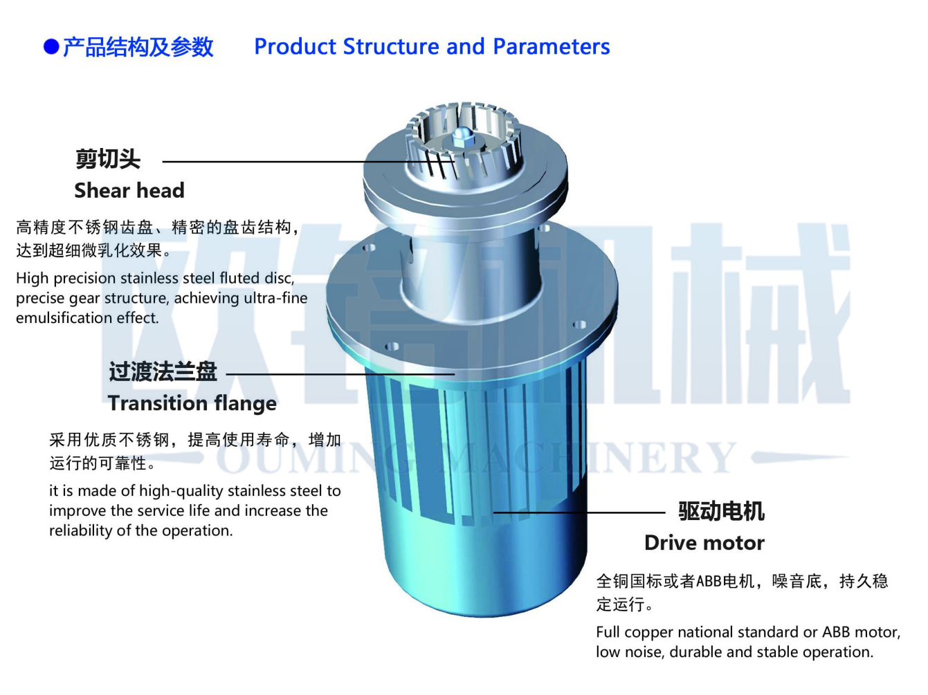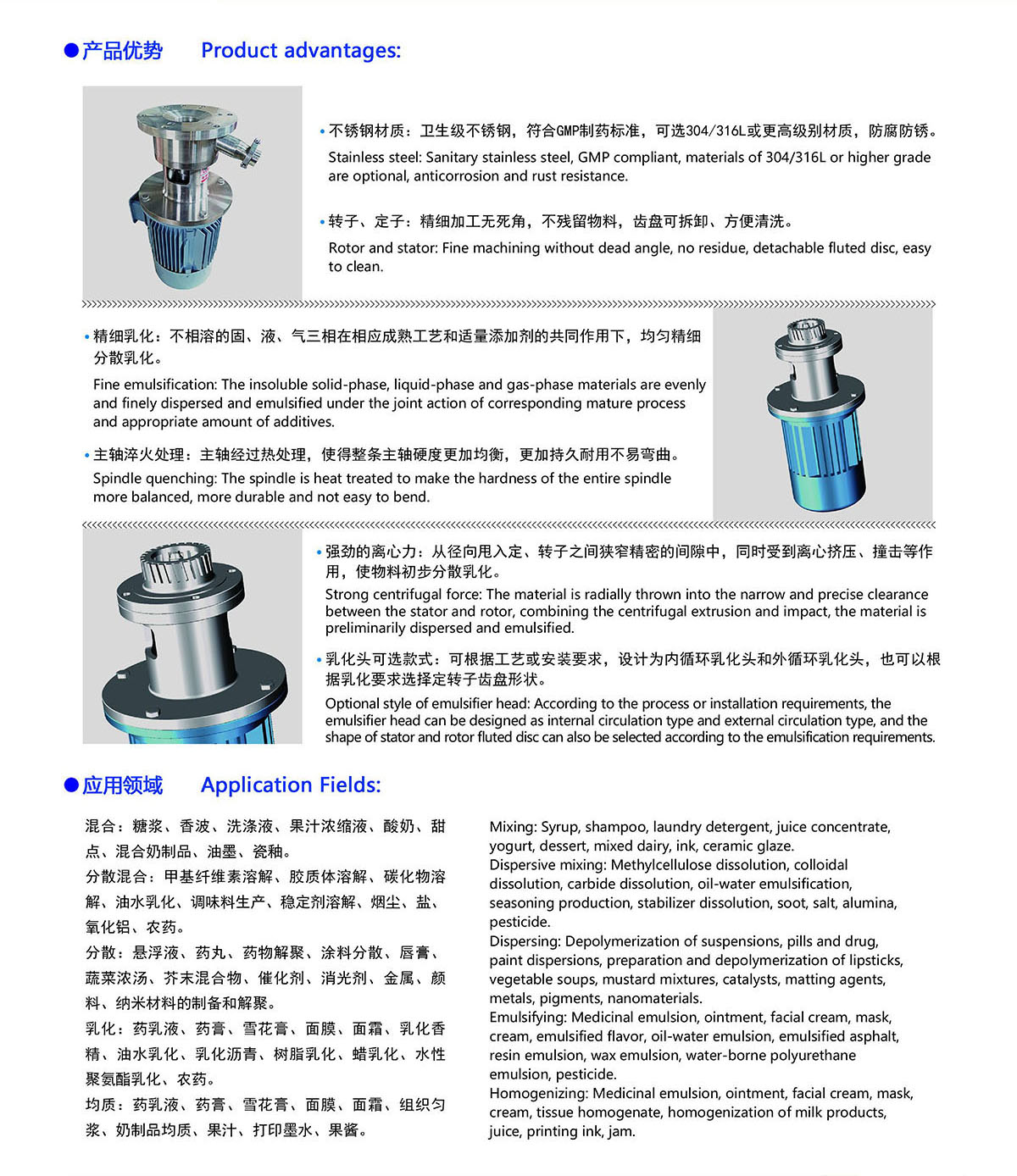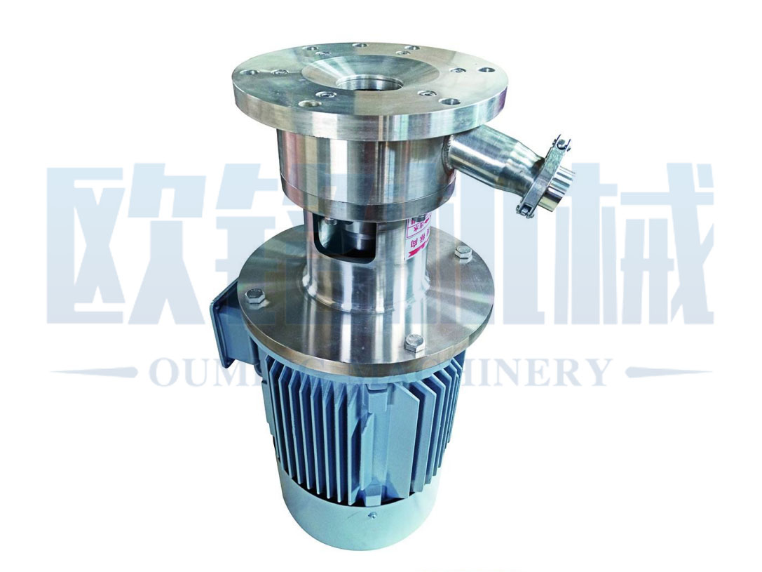 BEX釜底乳化泵是一種倒立式安裝于釜底的高剪切乳化設備,物料從主機上部與下部同時吸入,并向四周離心擠出,由于轉子高速旋轉所產生的高剪切線速度和高頻機械效應帶來的強勁動能,使物料在定子和轉子狹窄的間隙中受到強烈的機械及液力剪切、離心擠壓、液層摩擦、撞擊撕裂和湍流等綜合作用,從而使不相溶的固相、液相、氣相在相應成熟工藝和適量添加劑的共同作用下,瞬間均勻精細地分散乳化,經過高頻的循環往復,最終得到穩定品質的產品。